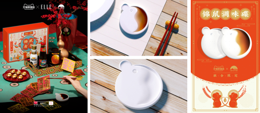 其中,天猫国潮来了携手经典国货品牌李锦记,设计了一款港风酱油礼盒,除了经典的XO酱之外,还搭配了一对特色的酱油小蝶,倒了酱油的碟,能够浮现可爱的「鼠」年生肖,让产品互动更有趣。
