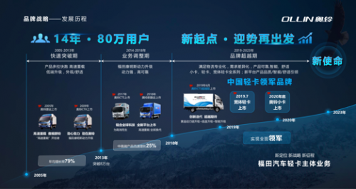 2005年,福田奥铃横空出世,凭借良好的产品性能和市场口碑,在14年积淀中不断创新发展,受到全行业的关注和青睐,有数据统计截至目前奥铃保有客户已拥有近80万;14年后的今天,新战略的重新发布,则标志着福田奥铃又迎来了新的征程。