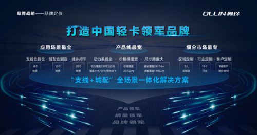 随着物流模式场景化,行业专业化加强,物流分工细化,区域差异明显,通用型产品向个性化、专用化转变成为趋势。针对2C、2B,干线仓到仓,城配仓到店以及城乡运输等不同场景,需要有针对性的产品解决方案。面对市场、客户、竞争的变化,奥铃品牌定位调整为“中国轻卡领军品牌”,致力于打造“应用场景最全、产品线最宽、细分市场最专”的“支线+城配”全场景一体化产品解决方案,能满足不同客户的需求,为不同客户创造更多价值。