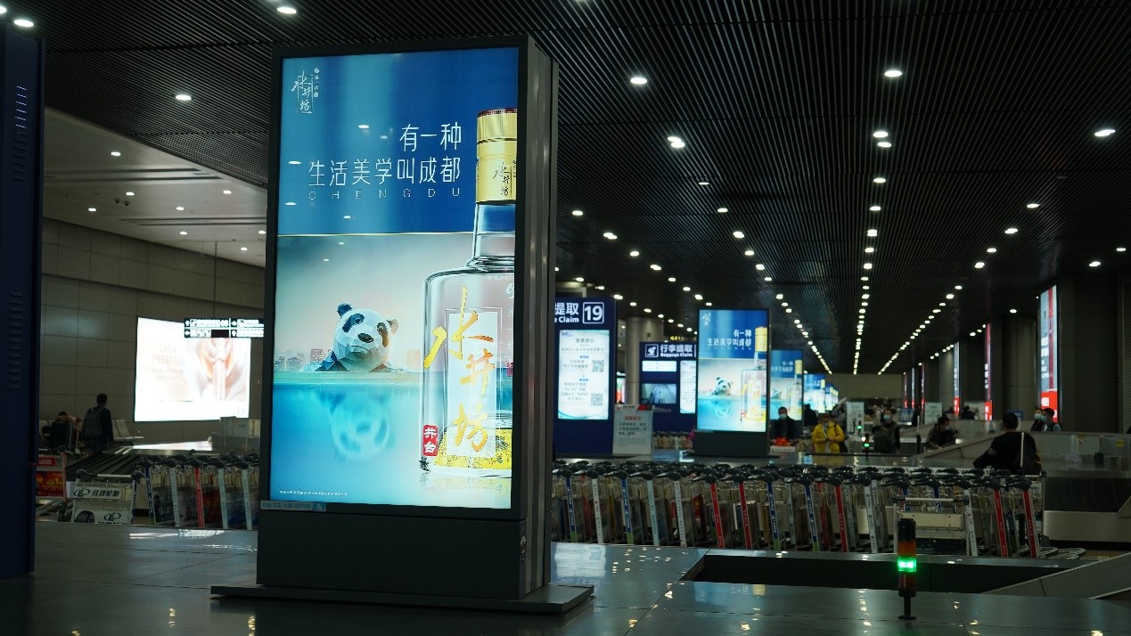 成都双流机场常年都是水井坊的广告“主阵地”,无论是在糖酒会期间,还是日常时刻,都能够让远道而来的客人们,一下飞机,就感受到成都“52°的热情”。