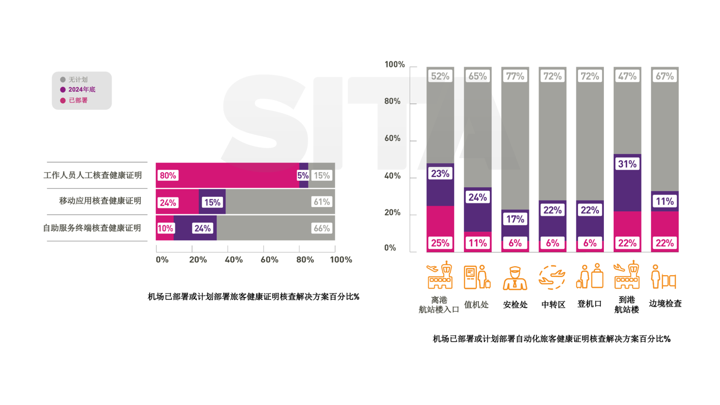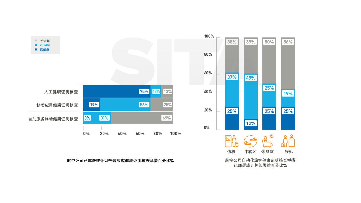 疫情期间实现旅客无缝旅程的关键节点是实现旅客健康证明的自动化验证。虽然 80% 的中国机场和 75% 中国航司在2021年依赖人工进行手动健康检查,但仍有相当一部分希望拥有支持移动应用程序的健康检查(75% 的航空公司和 39% 的机场)或支持自助服务终端的检查(31% 的航空公司和 34% 的机场)能在2024年到位。