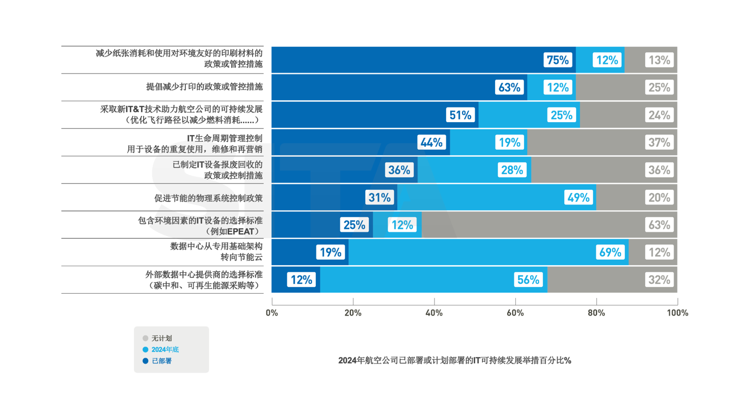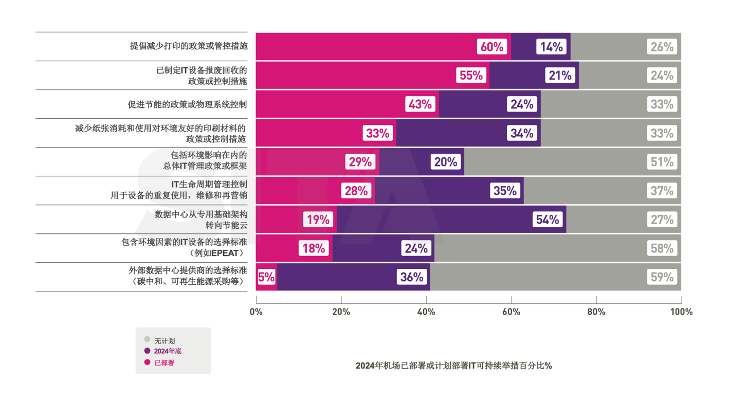多数中国航空公司还计划针对支持可持续发展的外部数据中心提供商实施选择标准,近一半的航空公司计划实施 IT 生命周期管理控制,促进设备的重复利用和维修。同时,机场正在利用智能建筑技术和自动化的前沿技术,几乎所有机场都预期在2024 年进行部署。