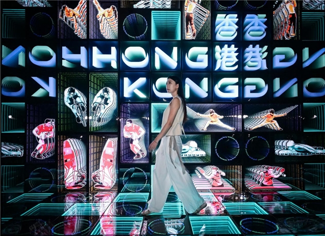 「香港─沉浸式之旅」巡回展览今日(八月九日)在广州展开,以艺术科技展示香港最新的都会魅力、优势和机遇,是香港特别行政区政府在粤港澳大湾区举办的推广活动之一。图为展览上以「体育动感之都」为主题的灯箱装置。