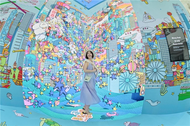 「香港─沉浸式之旅」巡回展览今日(八月九日)在广州展开,以艺术科技展示香港最新的都会魅力、优势和机遇,是香港特别行政区政府在粤港澳大湾区举办的推广活动之一。图为展览场内的拍照区,展示香港本地艺术家Messy Desk(李美欣)的插画设计。