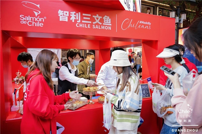 6号下午,智利商品市集面向公众的文化展示活动在越秀区北京路启动。活动设置了智利美食分享摊位和文化打卡点,市民不仅可以参与趣味问答和拍照打卡,近距离感受智利文化的独特魅力。同时还能品尝智利三文鱼、红酒、牛肉、猪肉及水果等特色产品,为广大市民提供了一个深入了解智利文化、美食与旅游资源的宝贵窗口。