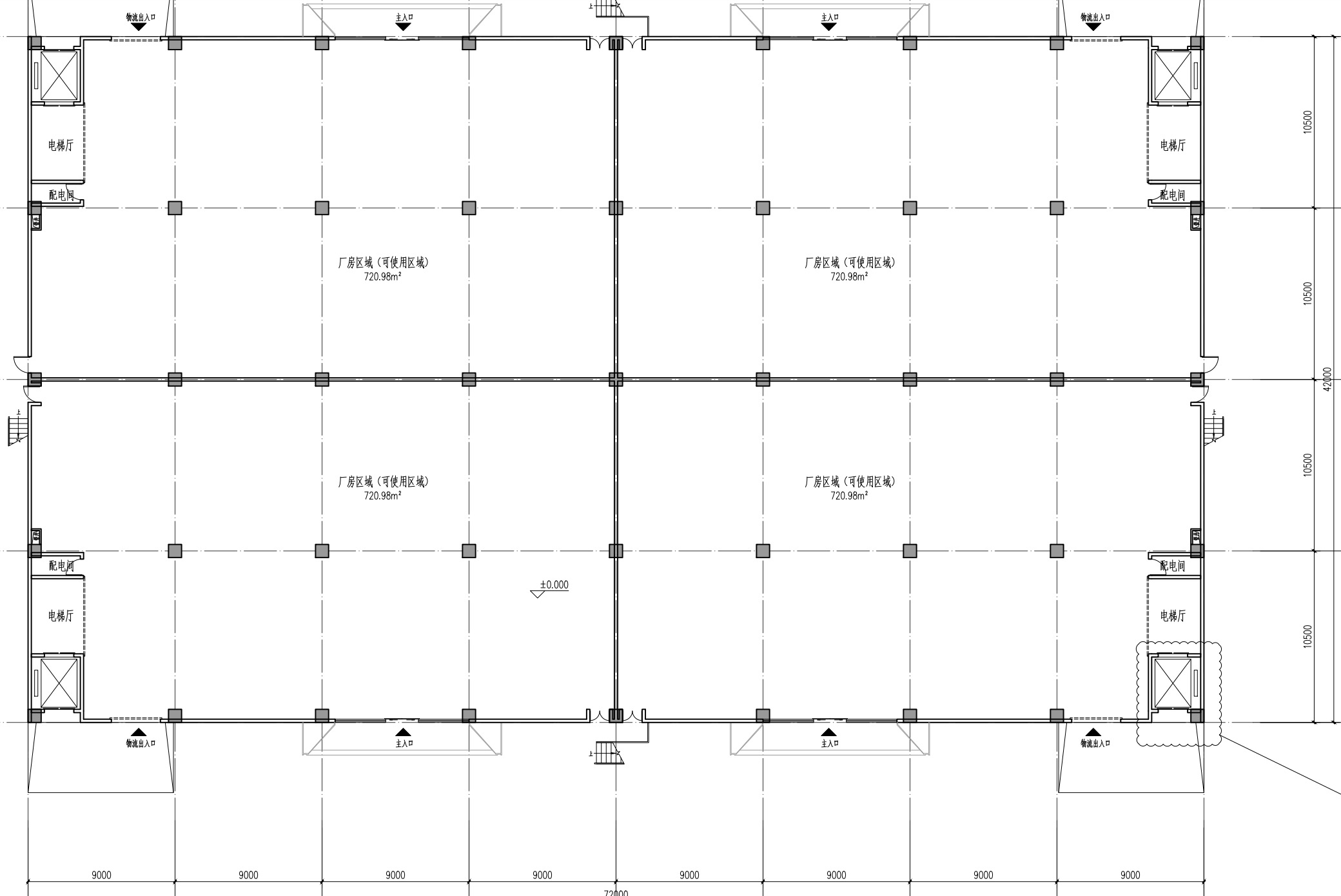 柱距:方正实用布局,柱距9米*10米
