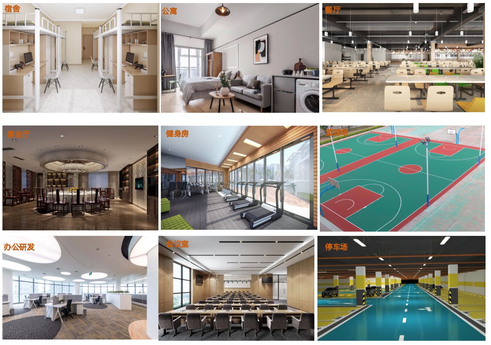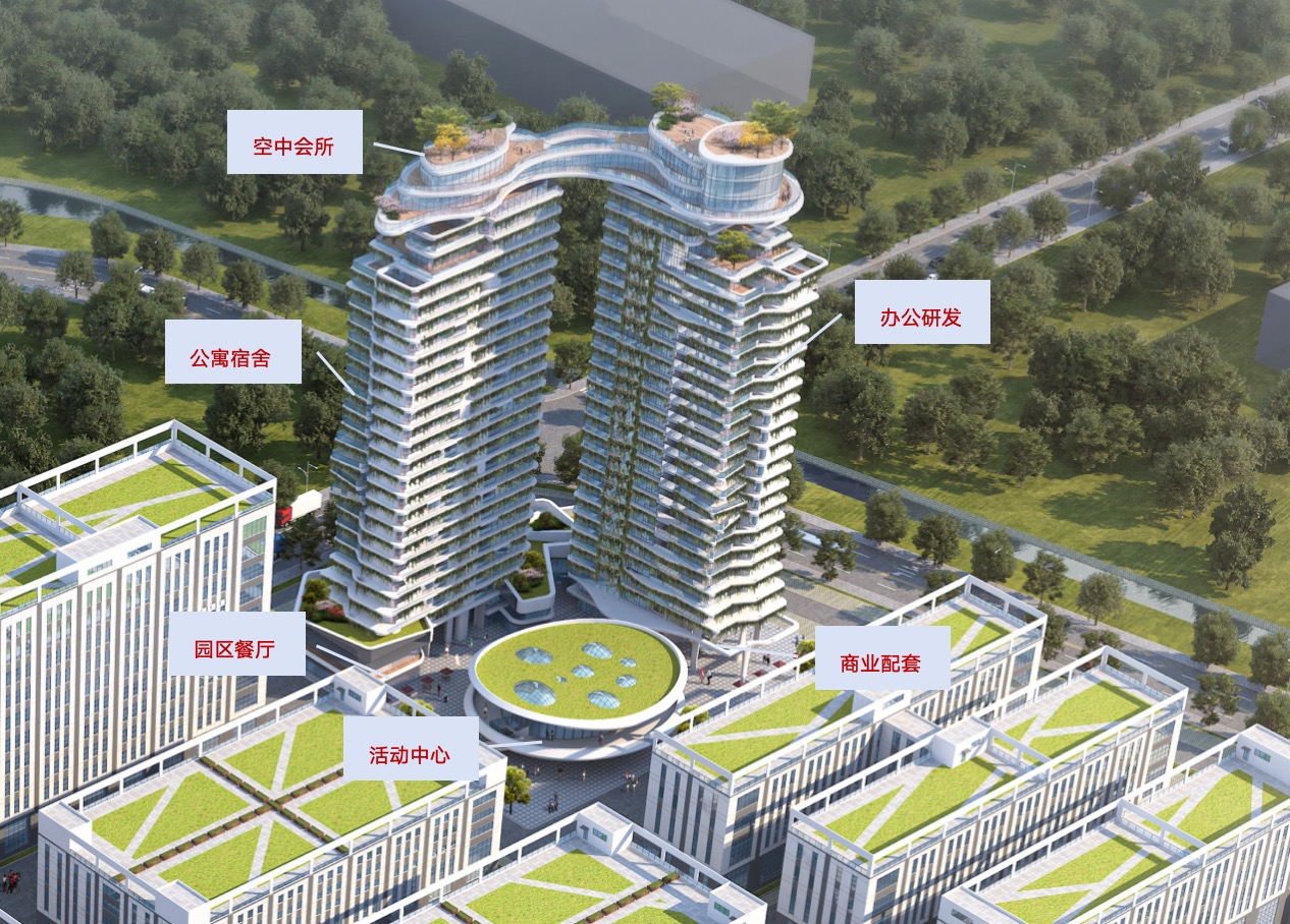 建筑规划:首层商业配套,2层园区餐厅,3-23层公寓宿舍,楼顶空中会所;附楼1-3层活动中心
